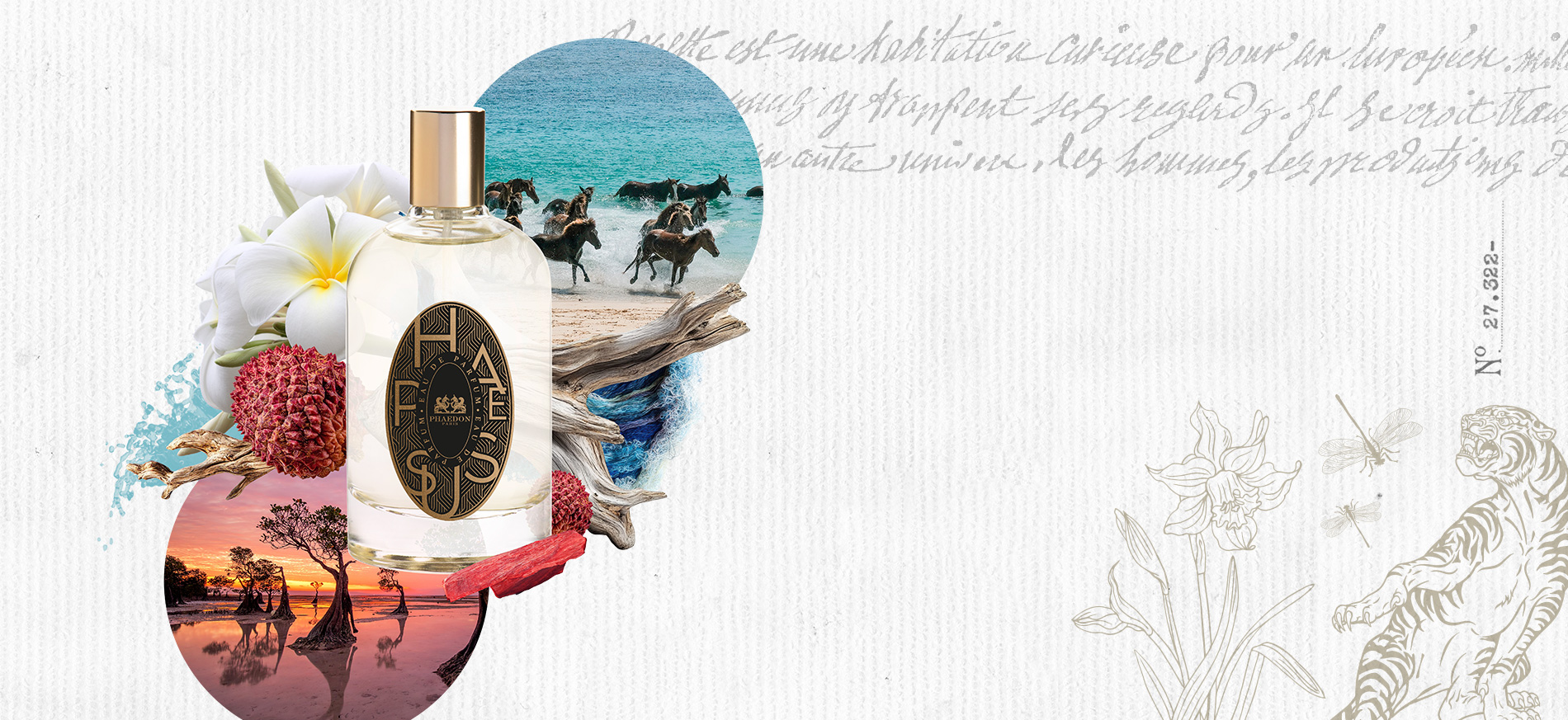 Les notes : Litchee, Frangipanier, Sève de Santal, Bois, Écume de Cheval (transpiration du cheval) & Océan.